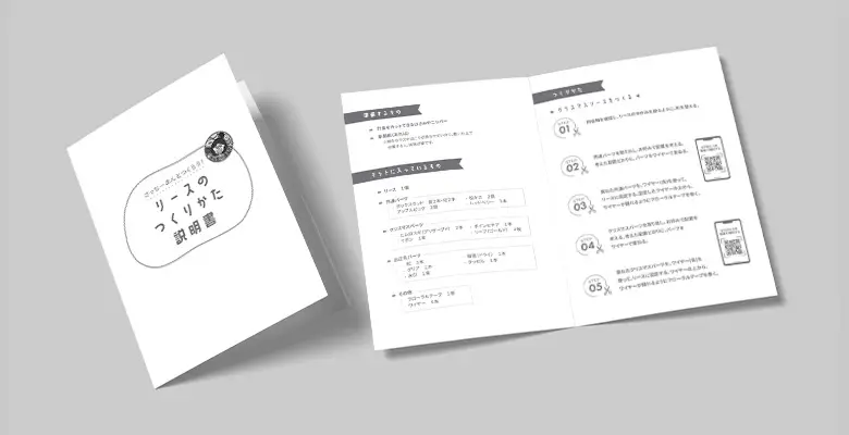 お正月飾りにつくり替えられる、2wayクリスマスリースのつくり方の説明書です。ライブ配信で配信者とキット購入者が一緒に作業をして楽しむイベントであり、また、初心者の方も多く参加されるということだったので、とにかくわかりやすく楽しそうな雰囲気の説明書を希望されていました。