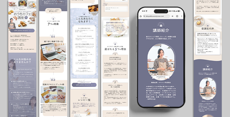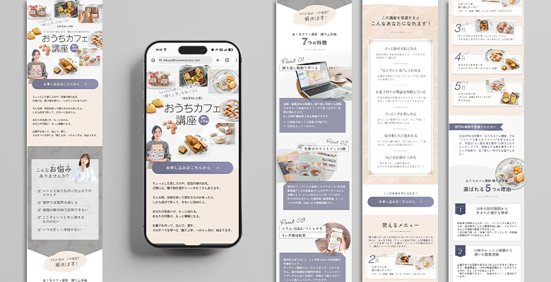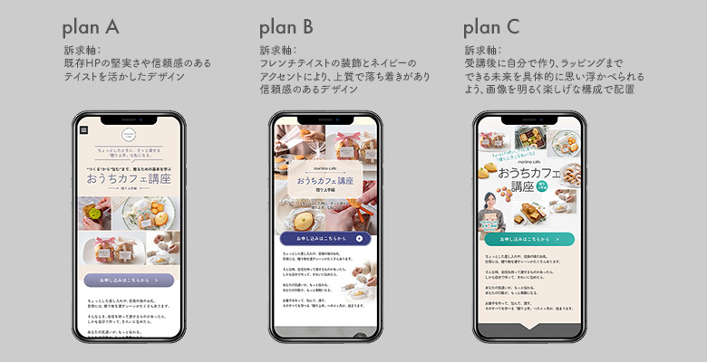 まずは、共有いただいた文章や写真をもとに、3案のデザインをご提案しました。ファーストビュー(FV)では、お菓子づくりにとどまらない「前回から進化した講座内容」が伝わることを重視。あわせて、先生のやさしい人柄や講座の楽しい雰囲気、学んだことがきちんと身につく講座としての信頼感を表現できるよう心がけました。
